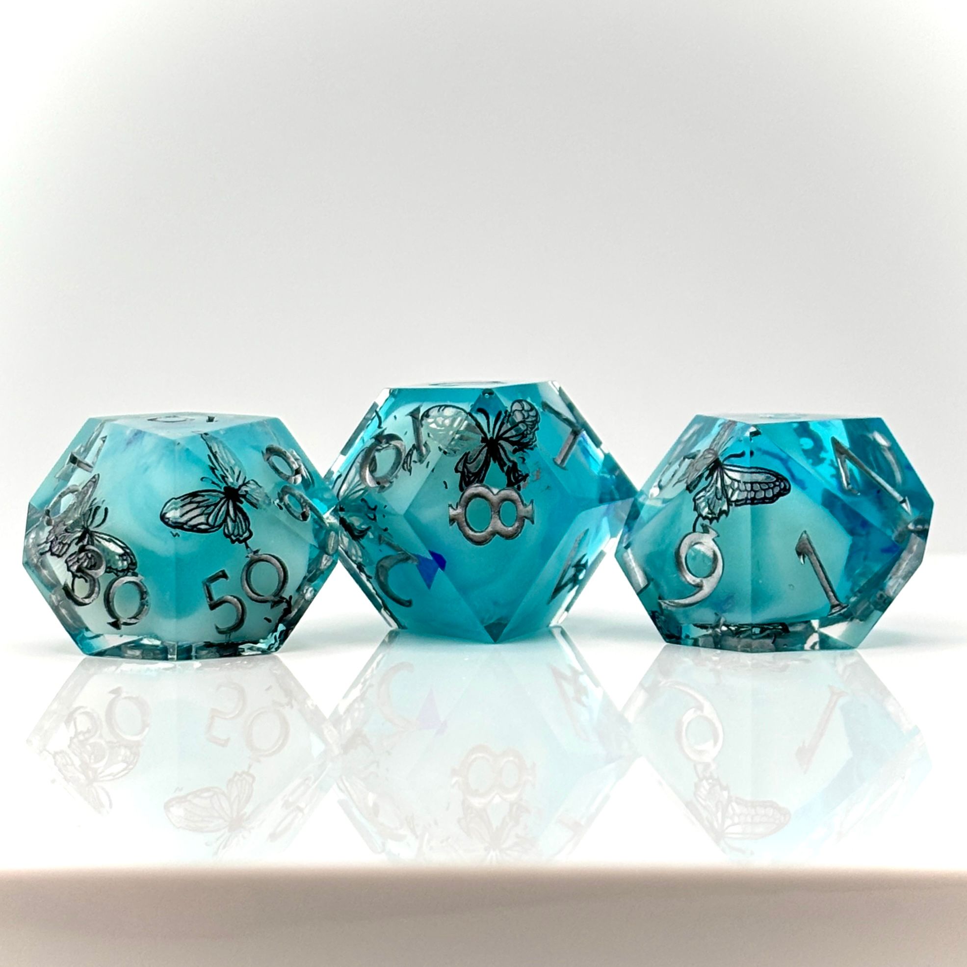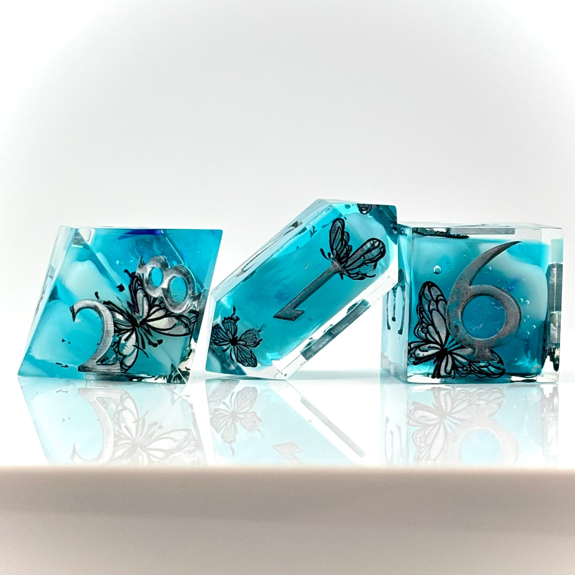 A light and airy blue cloud dice design decorated with shimmering silver butterflies. Unlike my typical cloud dice, this set was double cast.