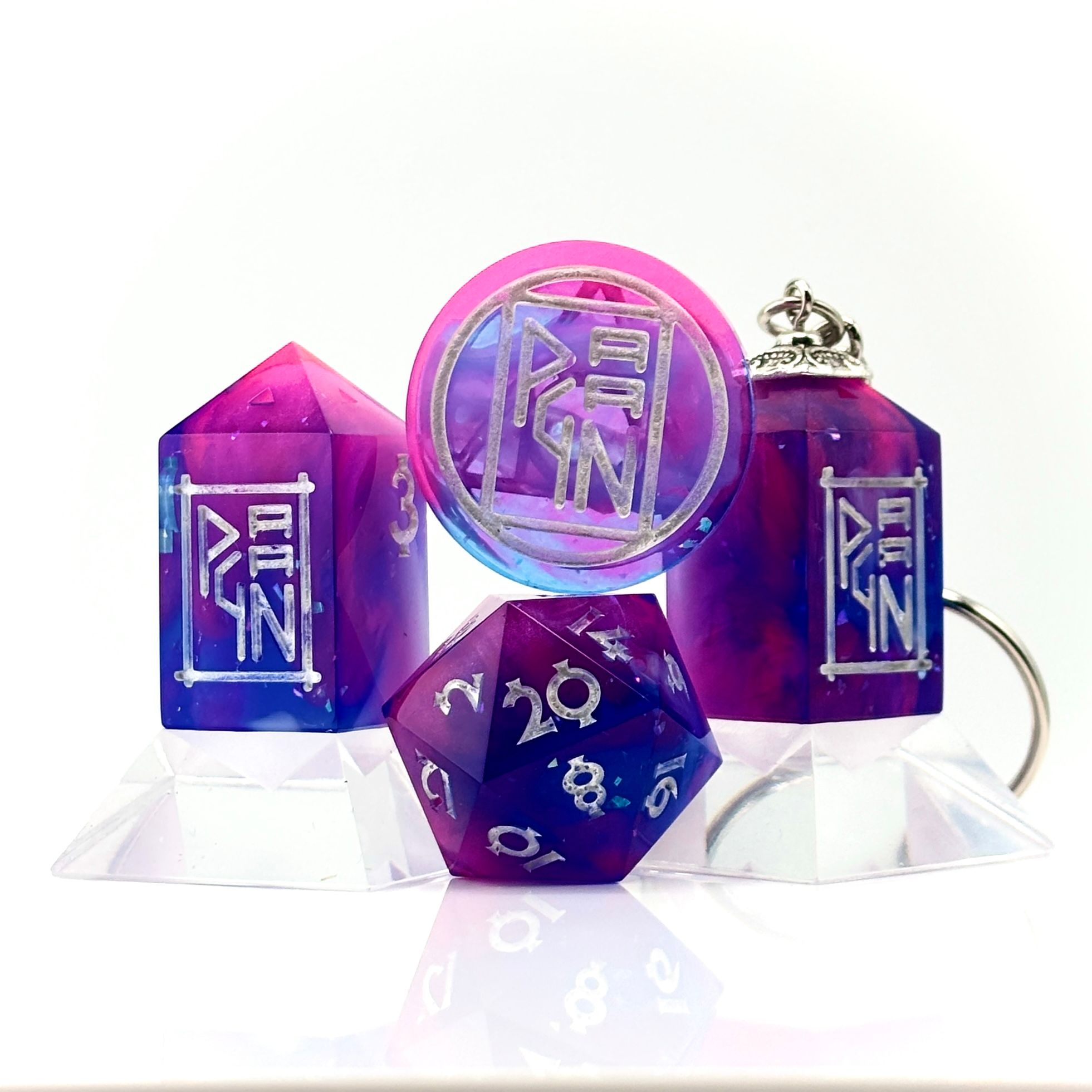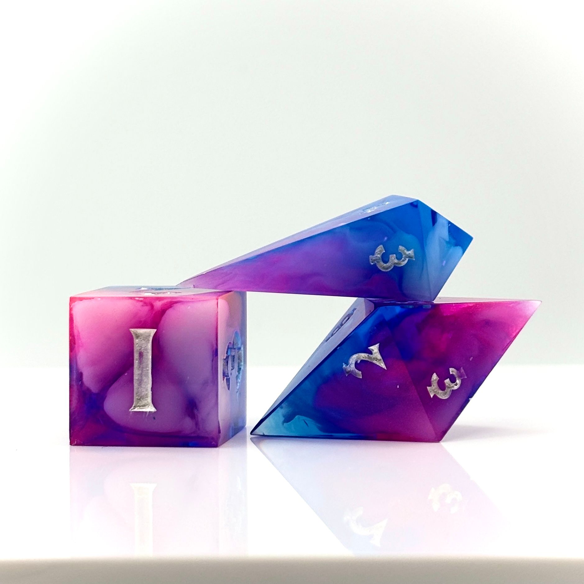 Just a simple and beautiful set of blue to purple cloud dice with a simple opalescent white ink.