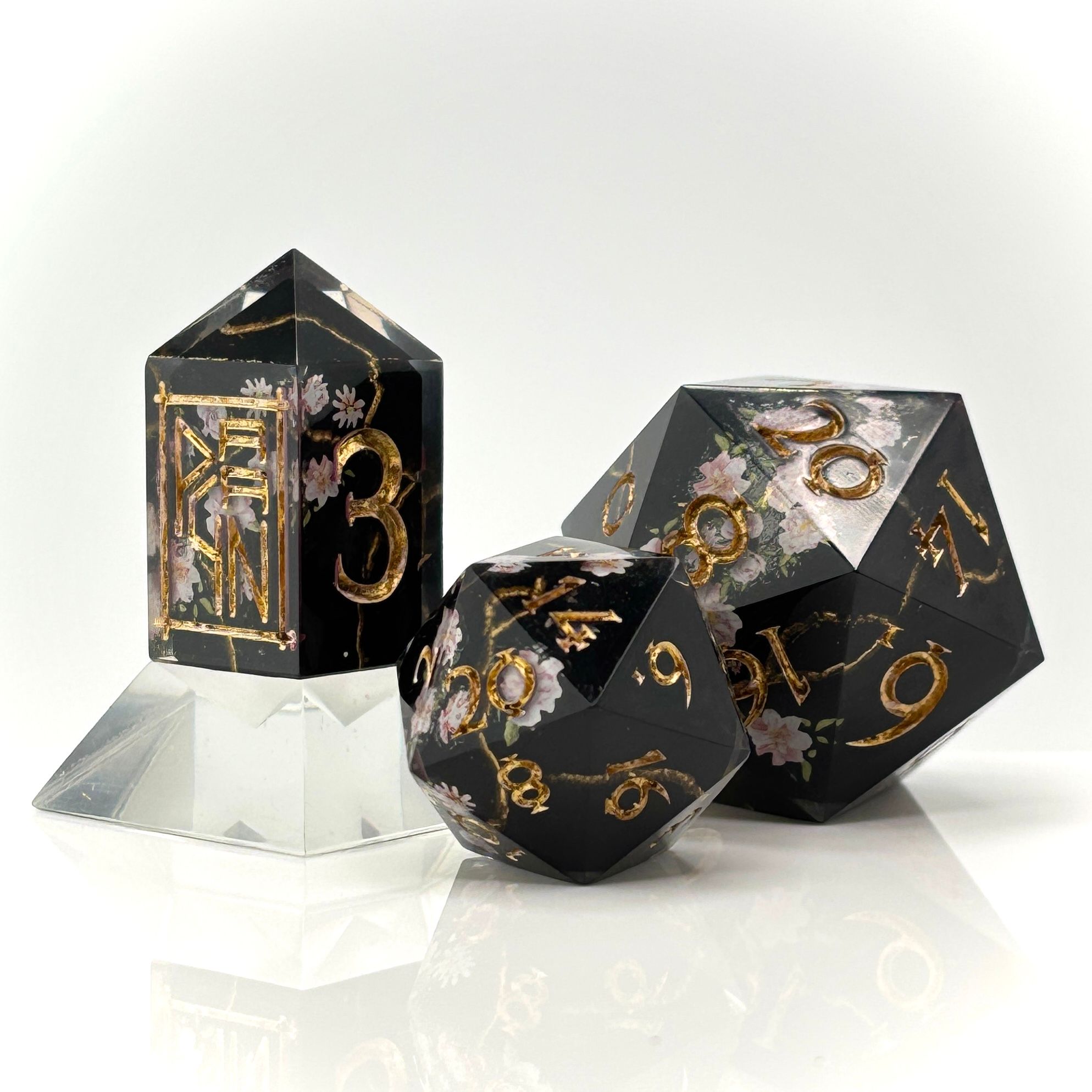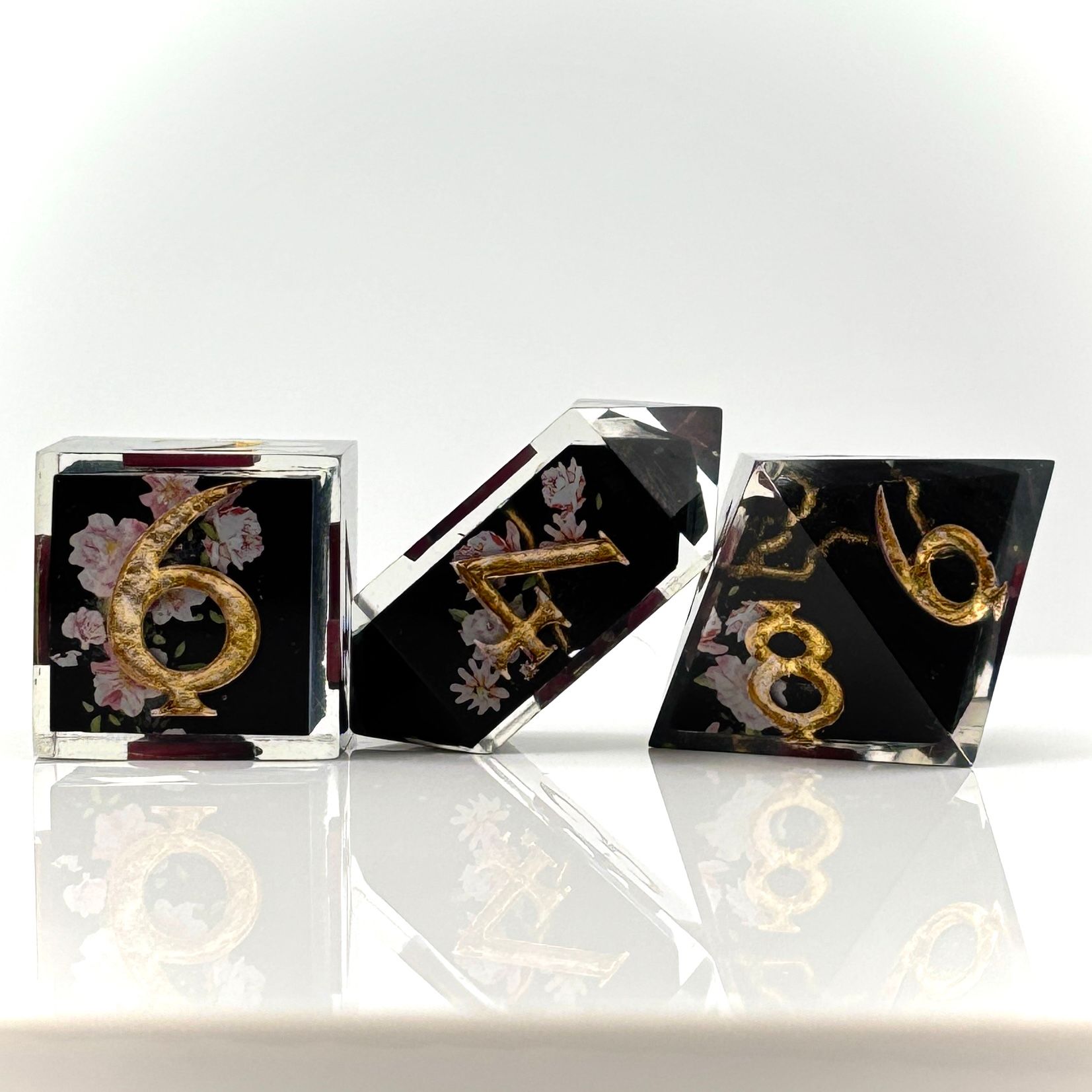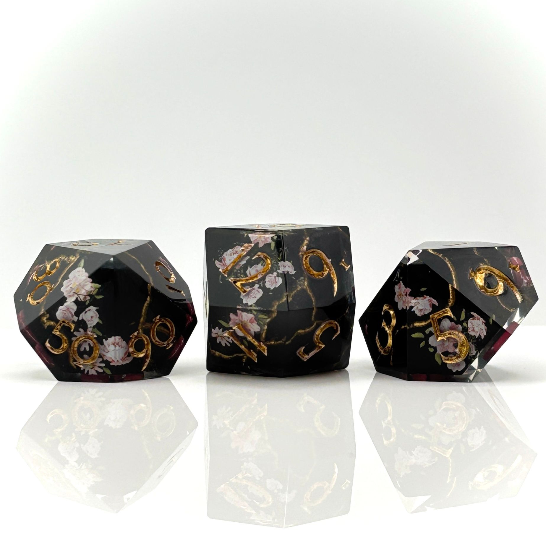 One of my first kintsugi sets. This suave black set was decorated with delicate rose blossoms and inked in a regal gold.