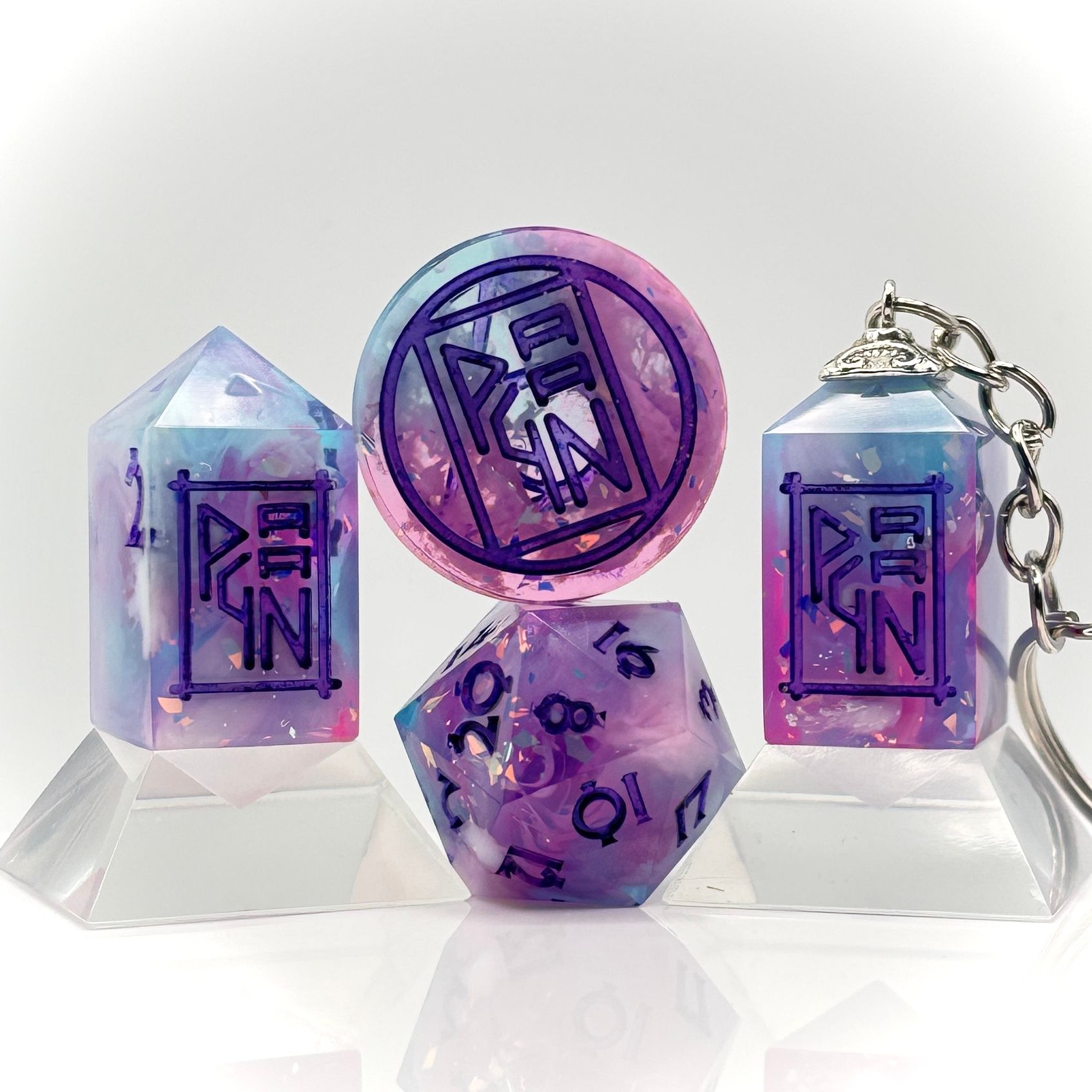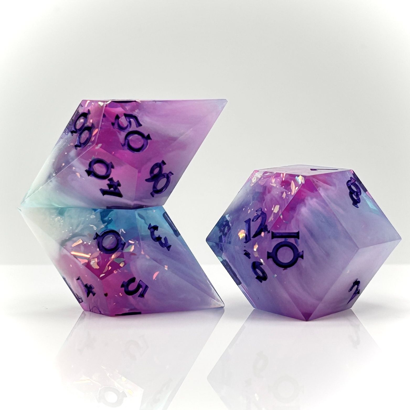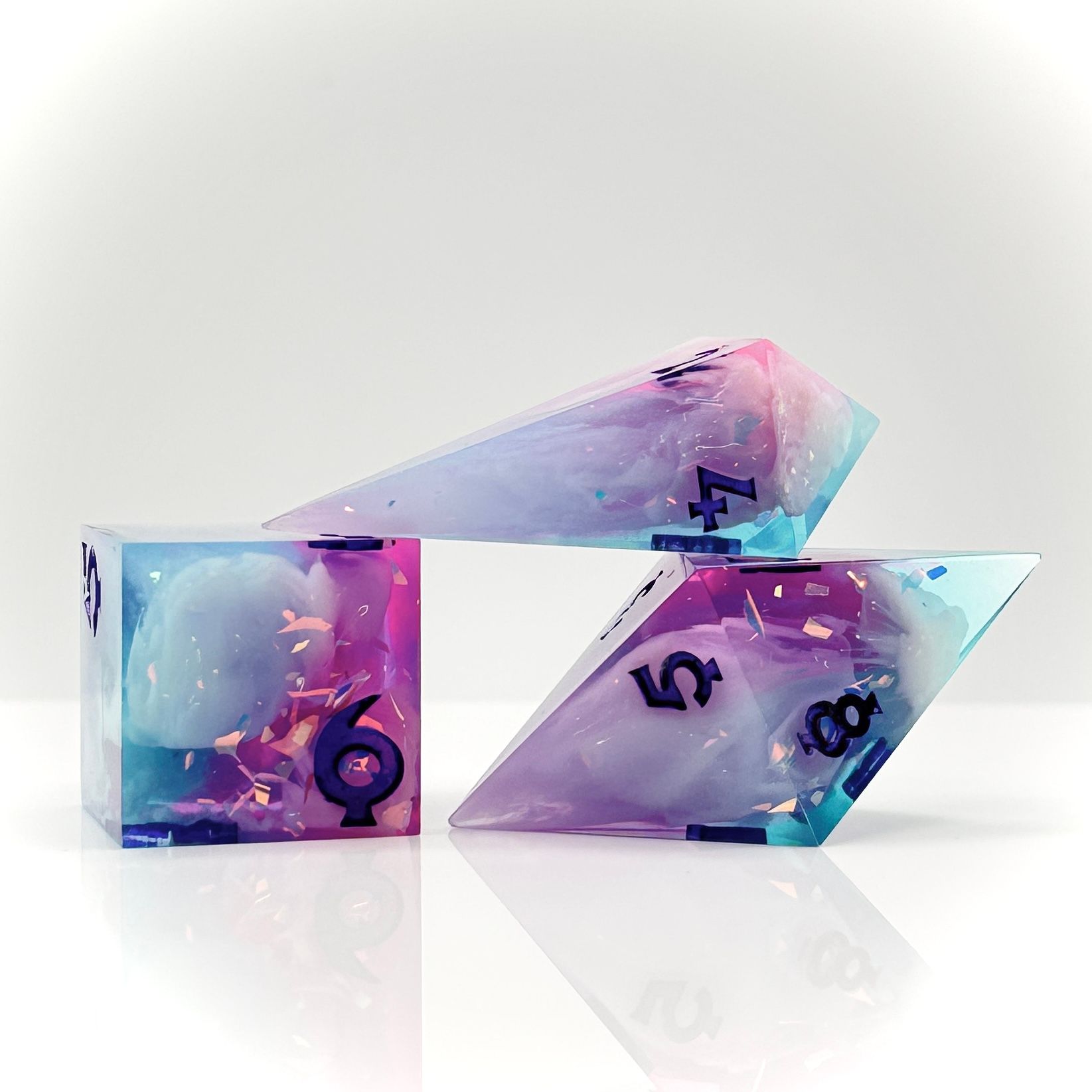 A beautiful blue and pink/purple set of cloud dice with a deep metallic ink and a liittle shimmer added with some mylar glitter.