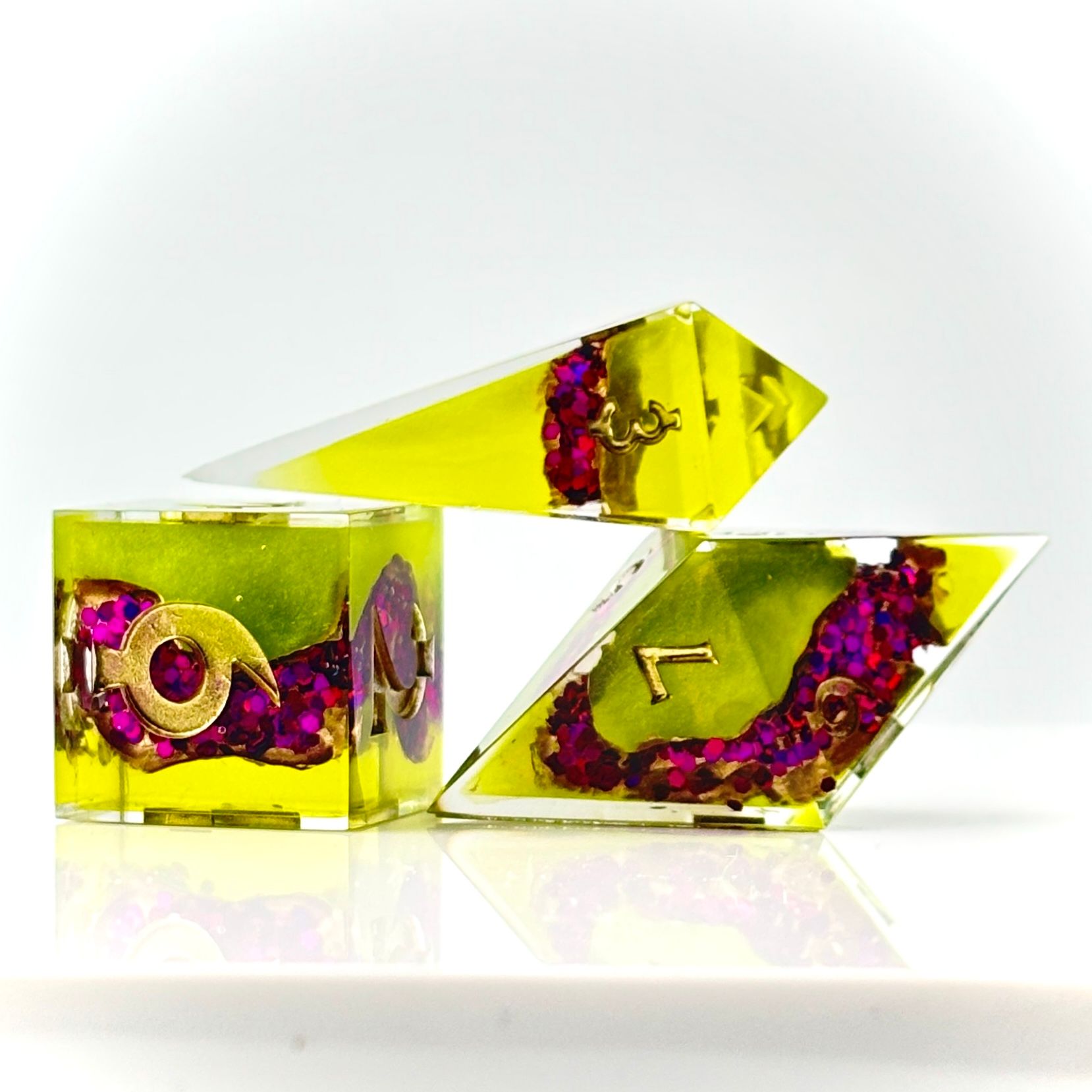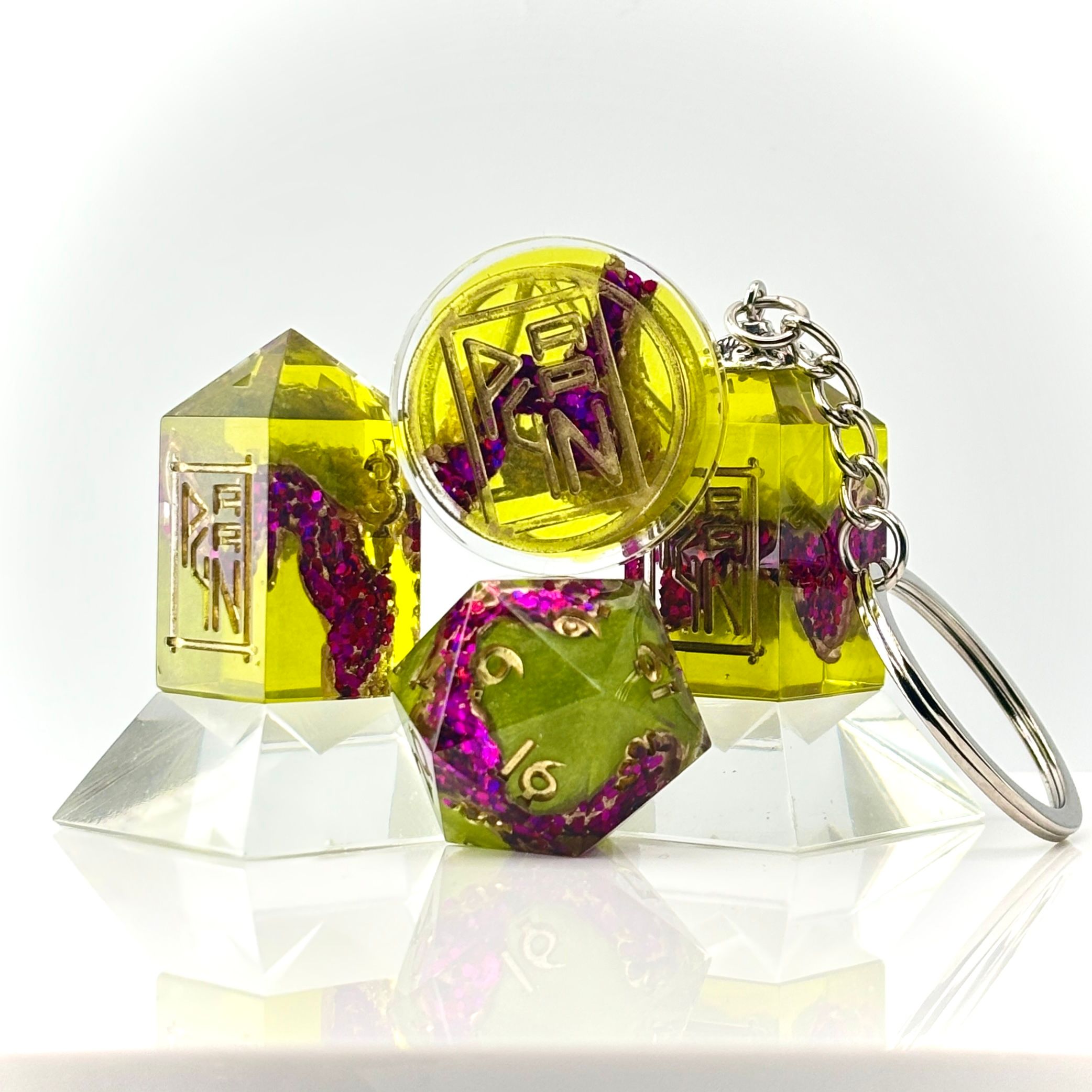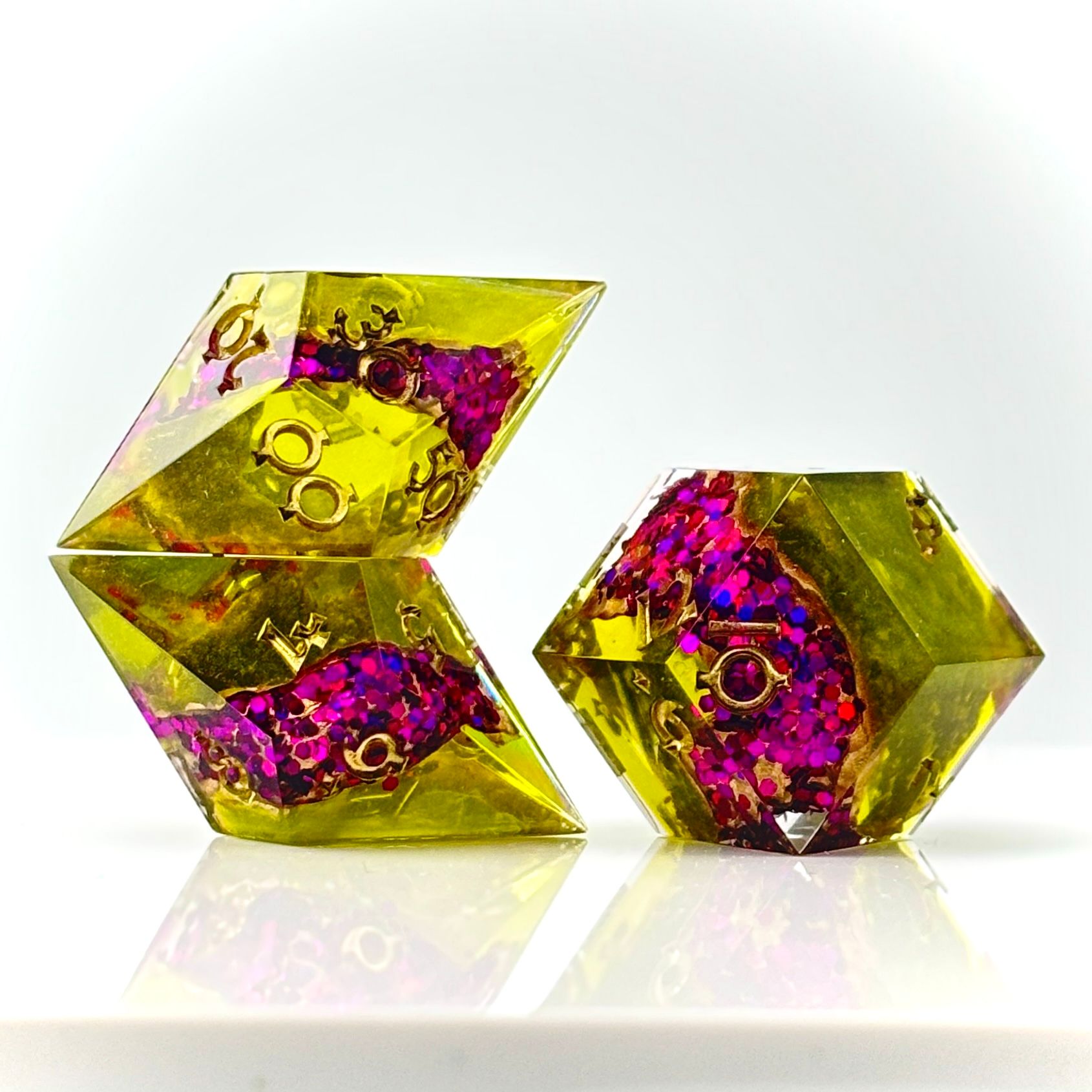 Another my exclusive Geode Flow designs. This set was aa little different in that the main body of the die was coloured resin. The inspo for this set came from my husbands love of Blenko coloured glass. Specifically he acquired two vases that were these two exact colours. I was mesmerised from the moment he unboxed them and had to see if I could capture that inspiration in a set of dice. Turns out that I could...LOL